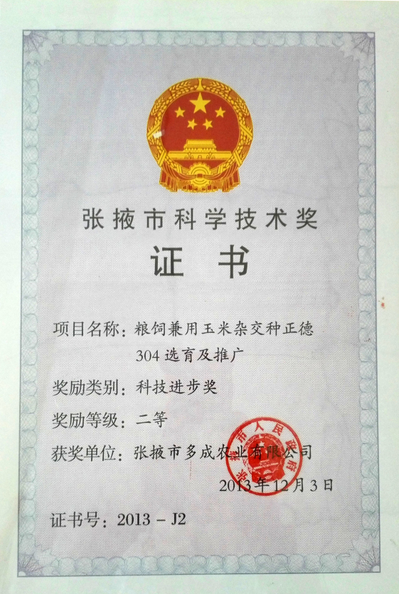 糧飼兼用玉米雜交種正德304選育及推廣——張掖市科學技術進步獎二等獎